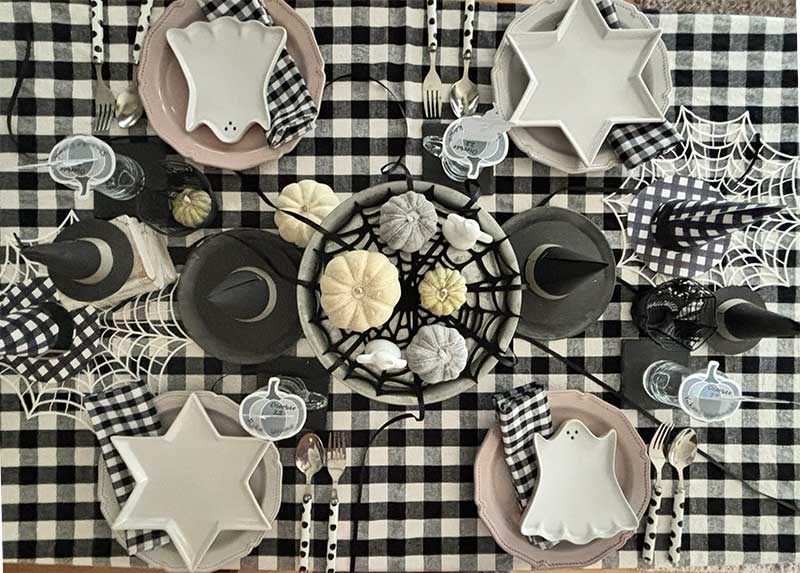 今年は色を押さえたテーブルコーデにしまして、手作りの魔女帽子がメインのアクセントに。