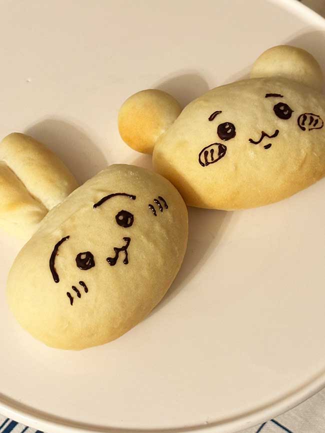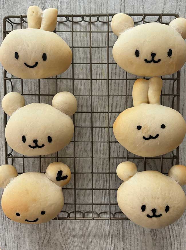 材料:強力粉・牛乳・無塩バター・はちみつ・きび砂糖・塩・インスタントドライイースト お顔を描くのにのりまたはチョコを使用する場合もあり